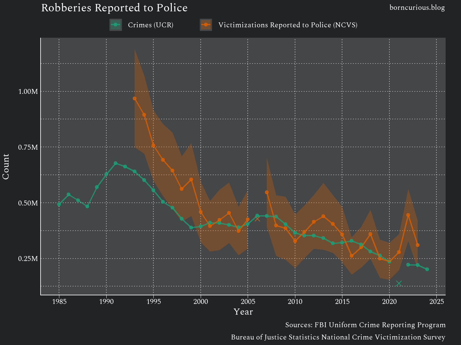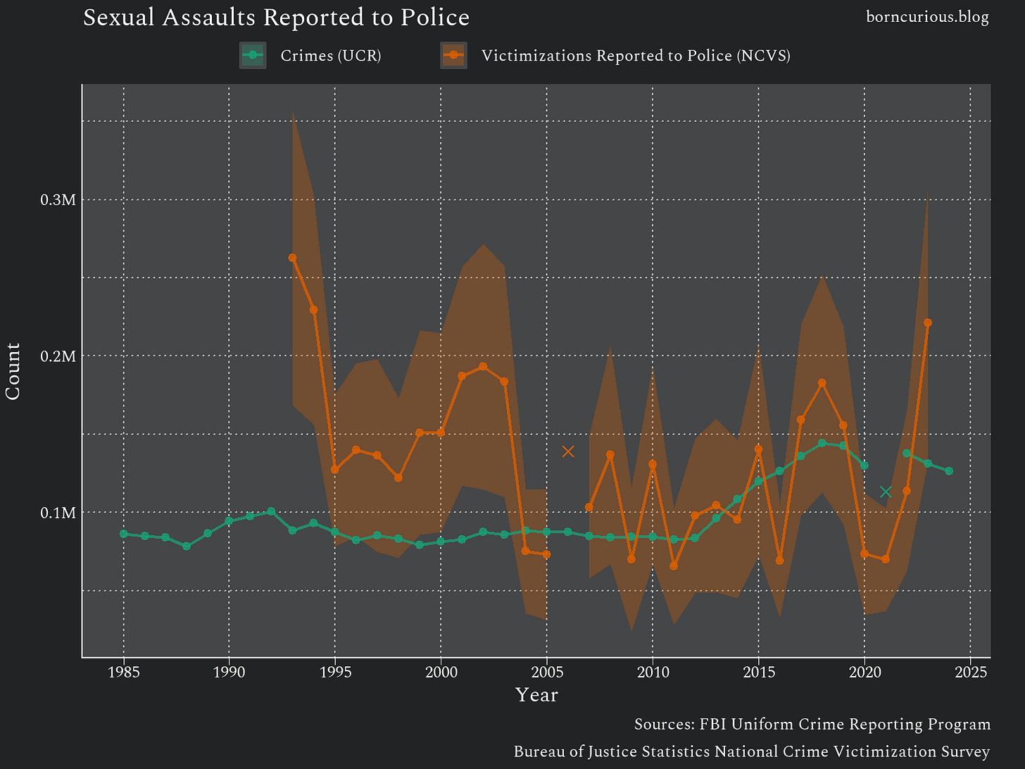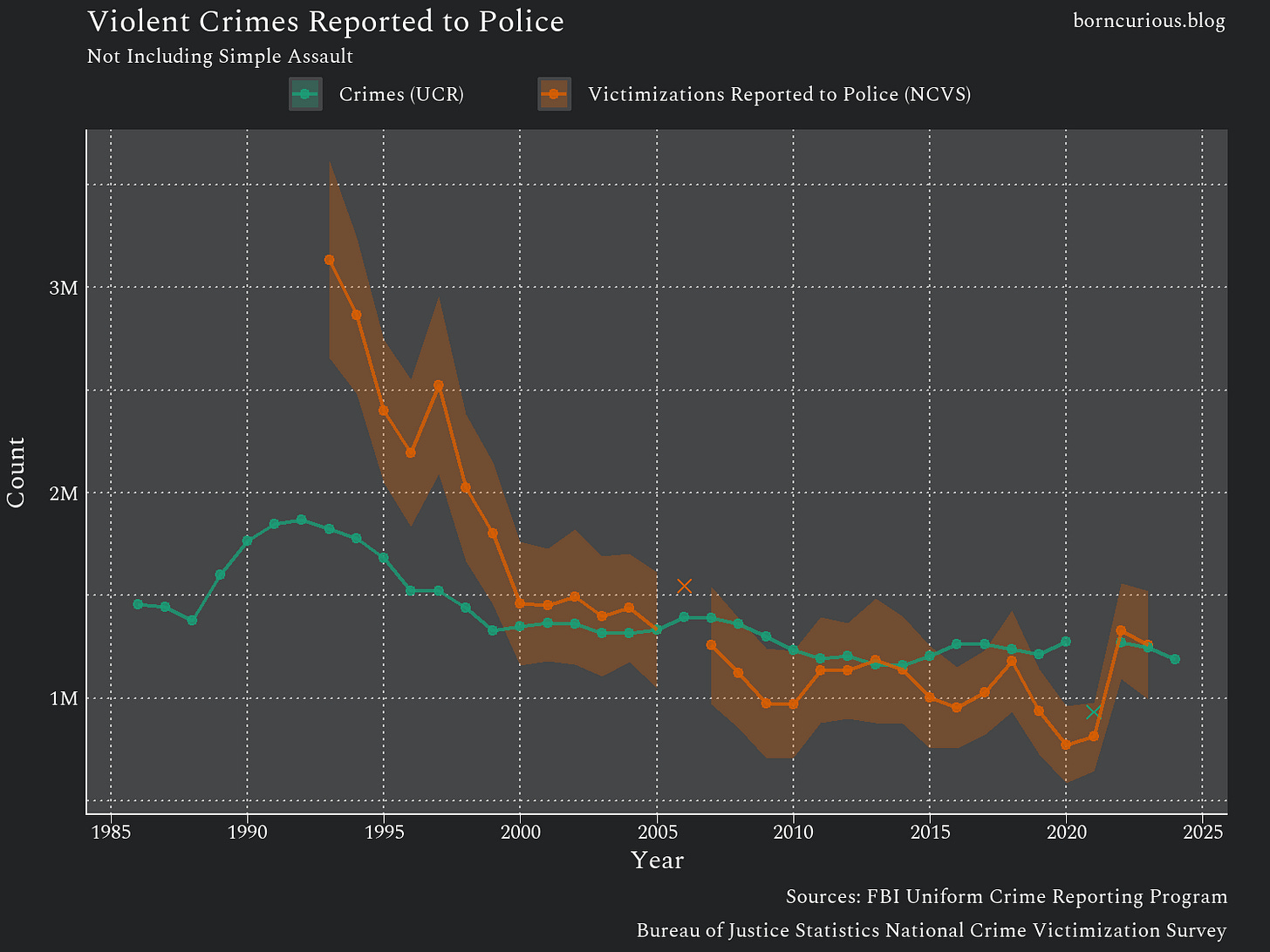 Something interesting happened in the year 2000. The gap between victimizations reported to the police from the NCVS and police agencies’ reporting of crimes to the UCR went away. The difference between the two lies within the sampling error of the NCVS, as indicated by the 95% confidence interval band plotted around the NCVS estimates.