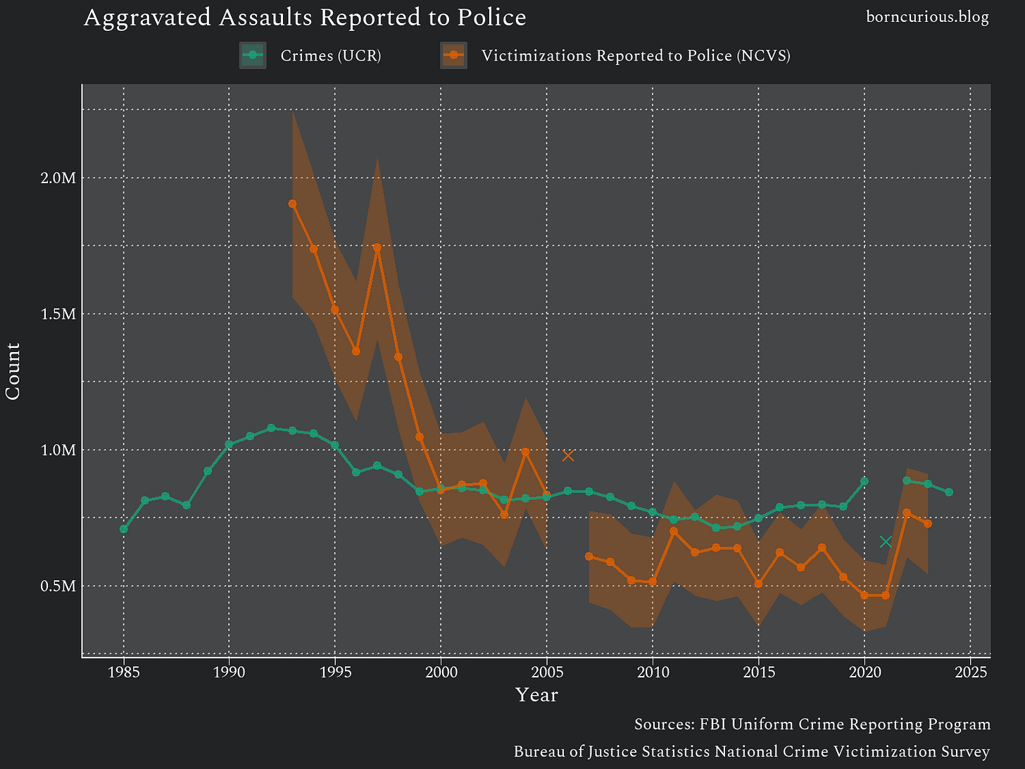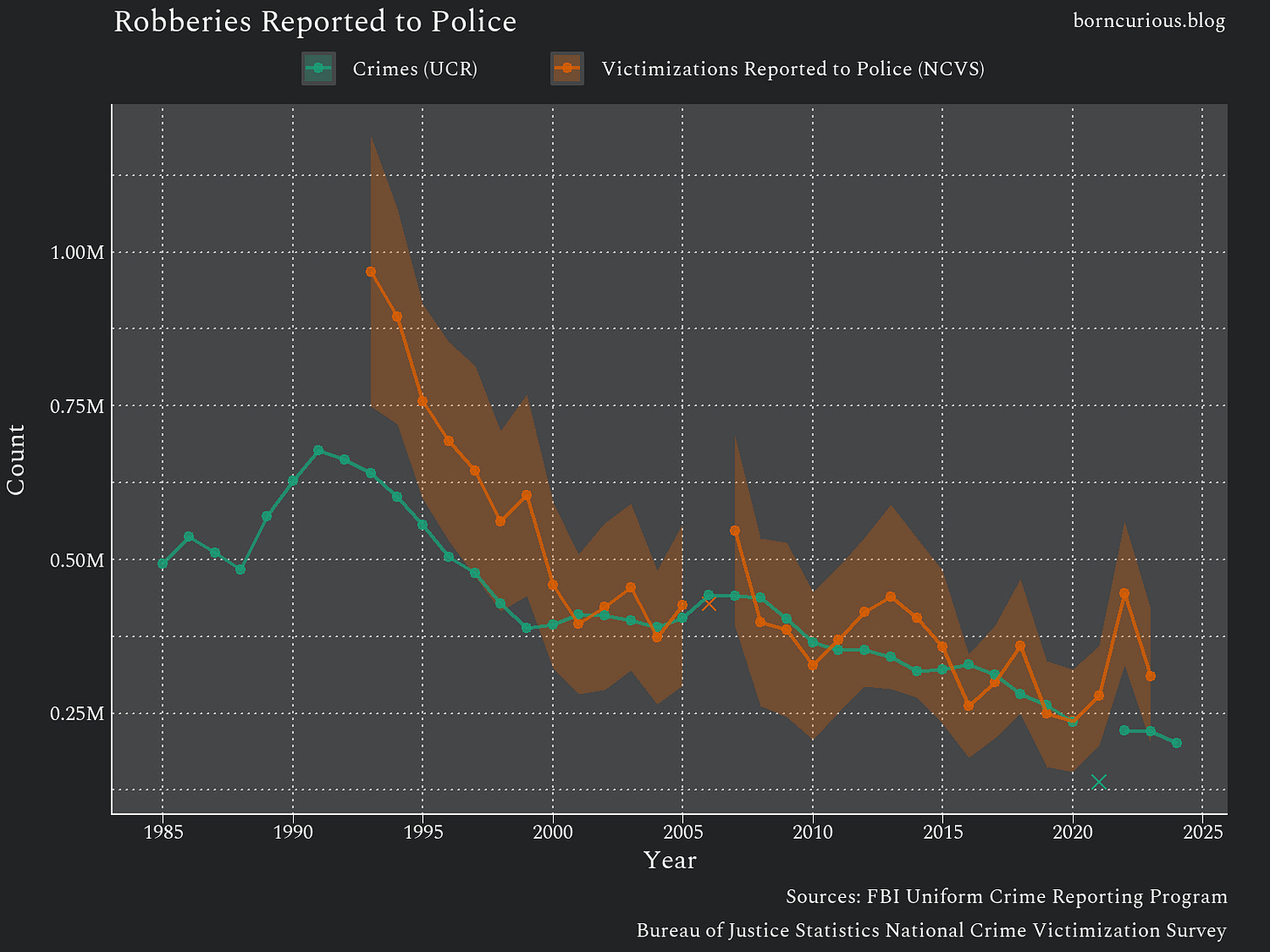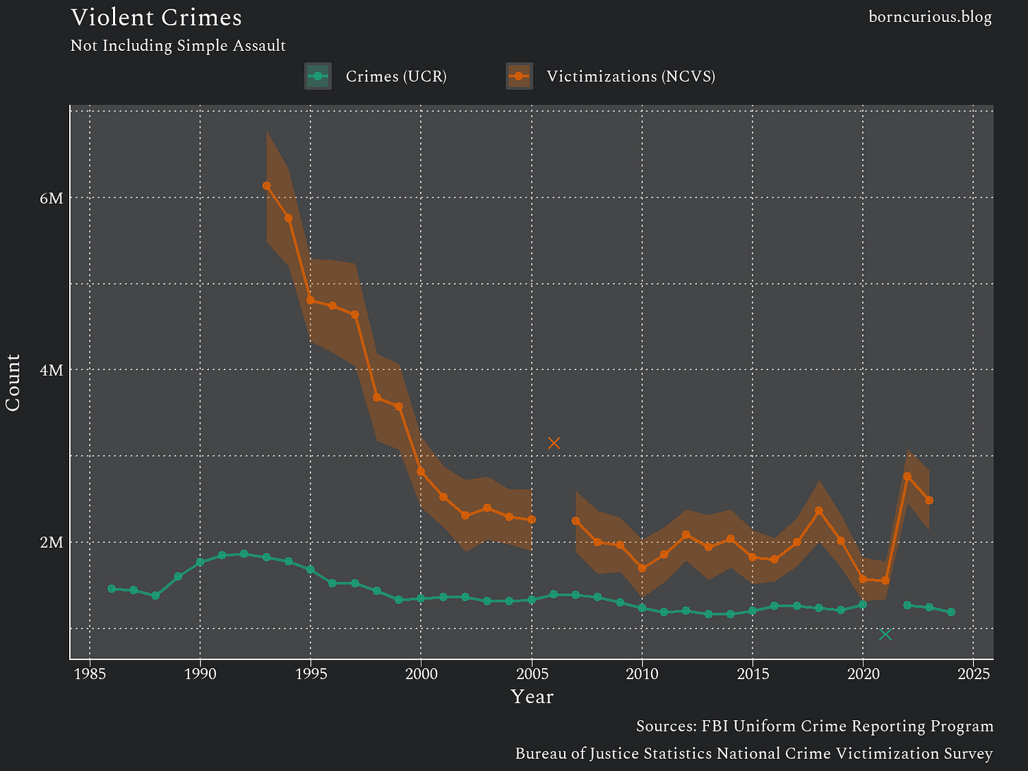 You may notice that the NCVS estimates of violent victimizations reported to police are actually lower than the UCR crime statistics in some years, e.g., 2016, 2019, and 2020. How can this be?
