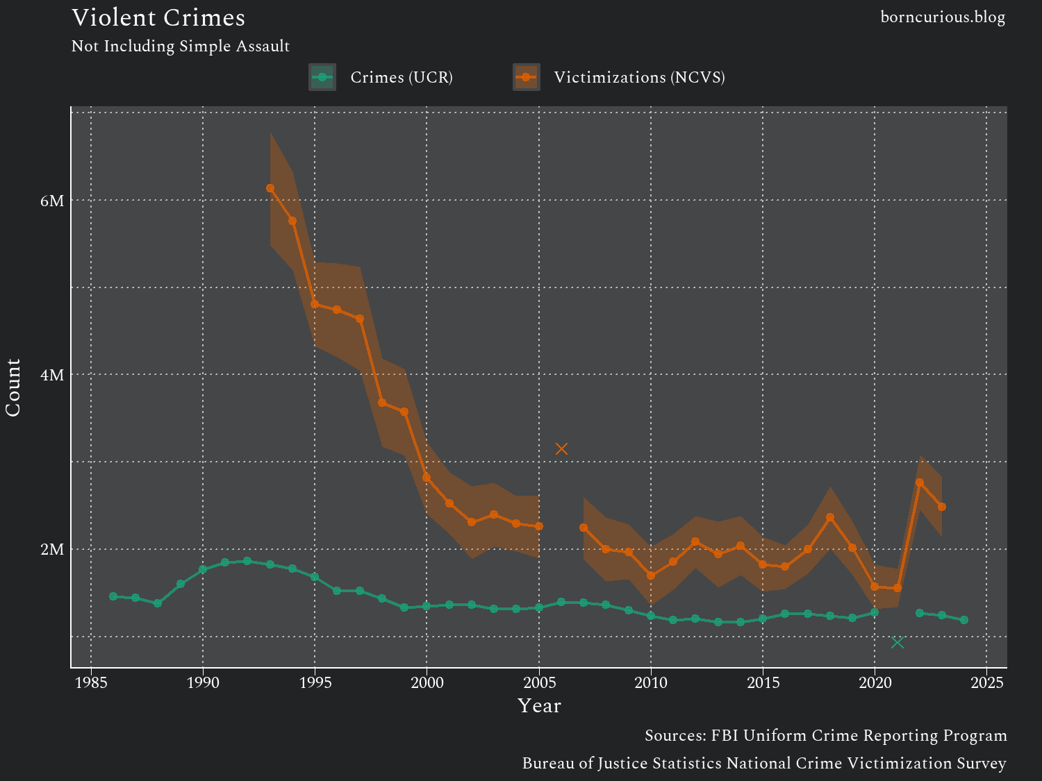 However, at the same time, the UCR reports 1,822,382 violent crimes in 1993, the NCVS estimates about 6.1 million violent crimes in 1993. Indeed, next to the plot of the NCVS data, the UCR plot almost looks flat.