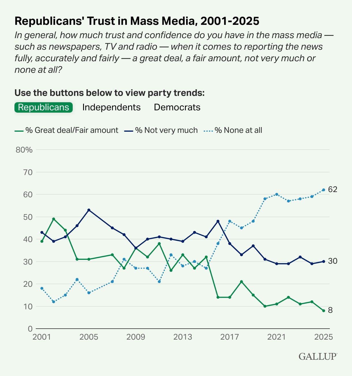 While Americans—and Republican-leaning voters in particular—might be justified in their distrust of mass media and academia, this does leave a void in information dissemination. The organs of cultural hegemony are also the vehicles that, in a more honest context, would spread knowledge. Into this vacuum of knowledge-spreading institutions, therefore, comes some amount of conspiracy theories, etc.
